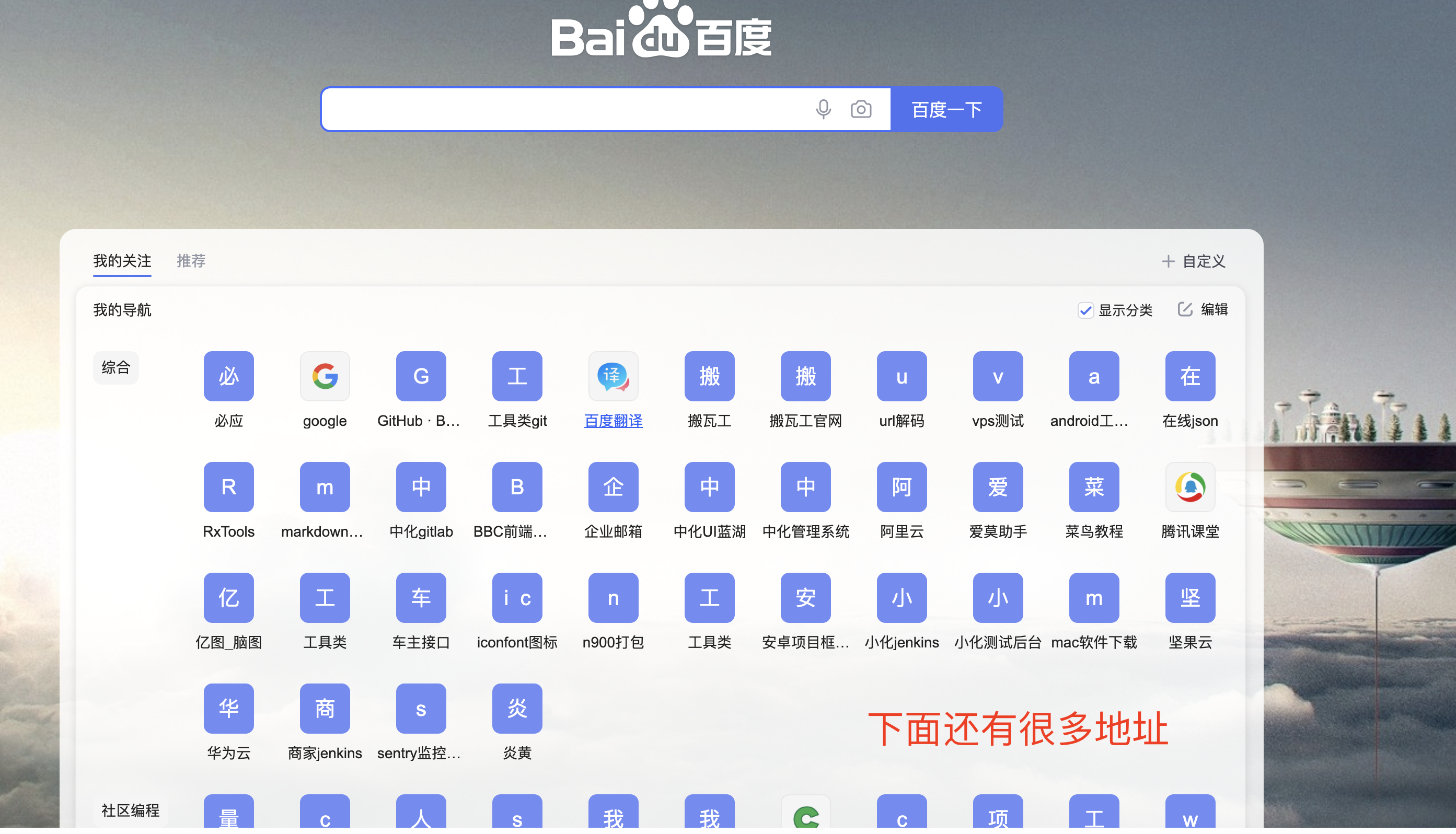 在我的百度首页有很多自己设置的导航链接(接近100个),里面放了我常用的网站, 如下图
