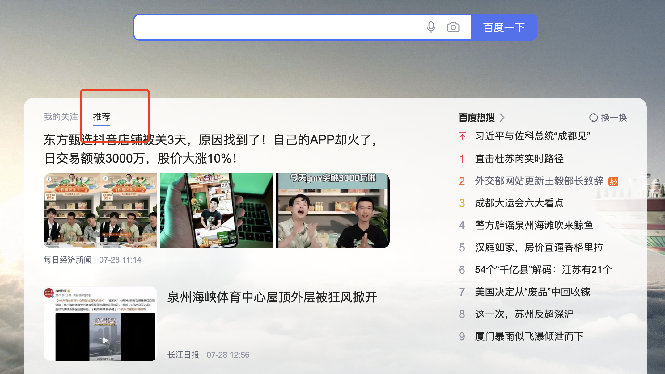 但是最近一段时间, 我发现百度做了一个很鸡贼的事情, 进入首页后他默认选择了推荐的tab页,